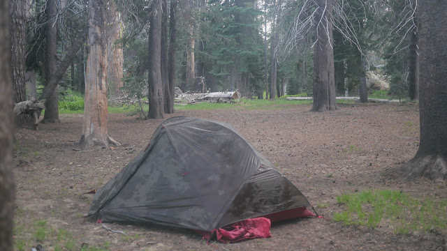 Levé autour de 5h30, je me prépare tranquillement et là un chevreuil qui sort de nulle part débarque à 10m de moi. Je me pose un peu pour l'observer puis fini de ranger mon bardas. Je décolle vers 6h15. Un premier mile tout plat pour se mettre en jambe puis montée de 4 miles. Il y a un torrent que le sentier longe. Il faut le traverser une première fois, tout va bien. Puis une seconde fois... Il y a un gros tronc puis un rocher puis un petit tronc pour terminer la traversée, allez je suis joueur, je garde mes chaussures de randos et mes habits. Tout va bien jusqu'au rocher; il reste 2 mètres sur le petit tronc qui est trempé et donc très glissant. Je m'engage... Mais mal, je tente de revenir en arrière, et là vous devinez la suite, je glisse et me retrouve dans l'eau glacée jusqu'à la taille... Sympa la baignade de 7h du mat'. Je continue mon ascension avec 2 flaques d'eau dans les chaussures (déjà qu'elles sont lourdes de base !). Le dernier mile est dans la neige et il n'y a plus vraiment de traces. Le col Benson Pass est en vue du coup je tire tout droit et atteint mon but. Première descente de la journée plutôt longue. Je cherche des anciens passages pour ne pas checker le GPS toutes les 5 minutes. Je rattrape finalement un groupe avec qui l'on se croisera toute la journée. Enfin en bas, on peut attaquer le second col, de la journée, le Seavey Pass. Montée en plein soleil, il fait chaud et là, à moins d'un mile du haut, un petit lac. Direct je me jette à l'eau, séchage sur une dalle de pierre en prenant le repas de midi je recroise le groupe du matin et on se marrera bien. C'est reparti après quelques galettes de maïs, du thon, de l'avocat et du saucisson au poivre! La descente sera épique, pentue et quasiment toute enneigée. Le sentier suis un moment le torrent, sauf que là il reste un gros névé (je vous mets une petite photo), vaut mieux pas tomber... Sauf que Mummy, expert dans le domaine, va glisser. Heureusement un arbre va stopper sa chute avant de tomber dans l'eau déchaînée! Après cet incident tout se passe bien. Il nous faudra traverser quelques rivières plus ou moins profondes mais après une dernière montée, puis descente, la pire sera à faire. Le lit se divise en 2 sections. Sur la première il y a un tronc d'arbre en travers mais il y a tellement d'eau que ça dépasse par dessus. Un pas après l'autre, faut être sûr de ses appuis et ne pas glisser. Ça passe. Arrive le second bras à traverser, et là, pas de tronc, va falloir se mouiller et pas qu'un peu à la vue du fond. Je suis avec le groupe que j'ai croisé toute la journée. Je m'engage le sac sur la tête. L'eau me monte jusque sous les pecs, le poids du sac me permet d'avoir encore les pieds qui touchent le sol et contrer le courant. Ça passe, vraiment épique cette traversée, de l'aventure comme on aime! Je me rhabille en vitesse avant d'être dévoré par les moustiques et quelques centaines de mètres plus loin je planterai ma tente après 20 bons miles. Ah ouais et histoire de boucler la boucle, un autre chevreuil est venu durant mon repas du soir, encore plus près que ce matin... Si ça continue comme ça je vais finir par en en trouver un dans ma tente un matin!