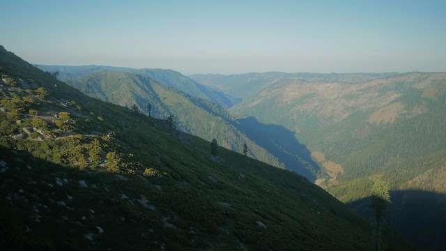 Réveil en sursaut, il fait déjà jour, je checke l'heure, ah non ça va 5h45. J'ai dormi sacrement profondément cette nuit. Je range mes affaires dans la tente, je vois déjà une foule de moustiques en attente sur la moustiquaire (on se croirait à l'ouverture des billets pour le hellfest). Je m'habille en conséquence, on dirait un apiculteur du dimanche avec ma moustiquaire de tête, mais au moins je suis peinard. Allez, 9 miles de quasi descente pour rejoindre Belden, qui n'est même pas un village mais plutôt un camping perdu entre 2 vallées. Après quelques premiers miles je sors des bois et là c'est encore une claque dans ma face, la vue est dantesque, surtout avec la lumière du matin. Le sentier aborde ensuite la descente au milieu de petits arbustes bien rêches qui le recouvre. Ça me va, ça me gratte les piqûres de moustiques sur les mollets. S'en suit une descente vertigineuse, tout en lacets, jusqu'en bas de la vallée. J'aurai droit à certains passages à un véritable festival de papillons, ça vole dans tous les sens, j'ai tenté une vidéo, je sais pas trop ce que ça donne... Enfin en bas, mes genoux me remercient. Après avoir traversé la ligne de chemin de fer, je rejoins le restaurant/boutique/saloon/accueil de Belden. Il y a déjà quelques hikers dont DrChill. C'est encore l'heure du petit dej', va pour un chocolat chaud...et des patates et un énorme steak de poulet frit sous sa sauce béchamel! Il y a possibilité de prendre une douche, 2dollars les 3 minutes, c'est cher pour ce que c'est, j'hésite, mais je suis vraiment crado et un décrassage à l'eau chaude avec du savon ça serait pas du luxe, je faiblis et craque. C'est court, mais c'est du bonheur. Bon vu comme c'est parti je fais une lessive commune avec DrChill. Voilà, reste plus qu'à faire 3 courses où je prendrai entre autre une bière pour le midpoint et une crème réhydratante pour mes petits petons qui sont secs de chez sec! Va pour un hamburger à midi, quelques coca et il est 15h, l'heure de repartir. Je compte tirer encore environ 6 miles de montée pour m'avancer un peu. Donc on y retourne, mais il fait une chaleur, je vous raconte pas (mais en fait, si). Pas un mile de fais que je suis trempé de sueur, c'était bien la peine de se laver tient! Le calvaire se termine après environ 2h quand j'entrerai dans le Lassen national parc. Je prends de l'eau à une source un peu avant mon camp et me fais dégommer par des moustiques et des espèces de mouches jaunâtres qui piquent bien fort aussi. Je m'éternise pas et fonce planter ma tente. Petit rituel du soir avec crème pour les pieds en plus (j'espère qu'il n'y a pas un ours qui va venir me les lécher cette nuit...).